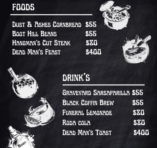 料理や飲み物は見た目こそ禍々しいものの、味は絶品。荒くれ者たちの腹を満たすジャンキーな料理たちはサルーンのギャンブルを盛り立てる。